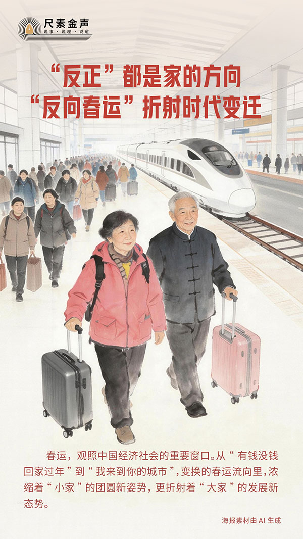 马年春运,往来交织的密集人流中,一股“反向春运”的潮流格外醒目:这场大规模周期性迁徙里,不只有子女的单向返乡,更有父母长辈的反向奔赴,以及先回家再出游的错峰旅行。