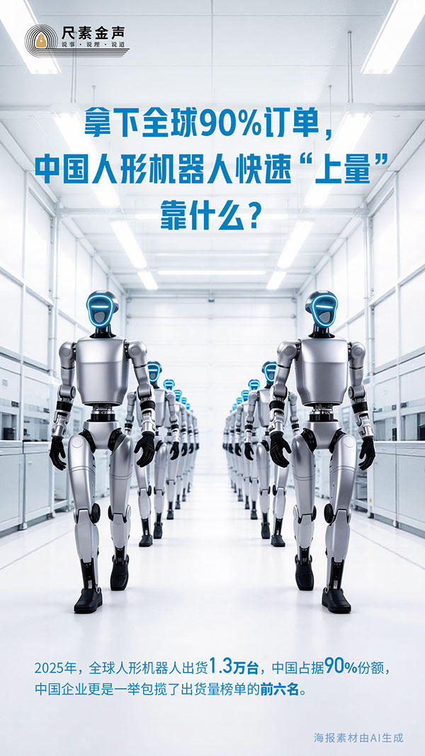 近日,国际研究机构奥姆迪亚公司(Omdia)公布的数据显示,2025年,全球人形机器人出货1.3万台,中国占据90%份额,中国企业更是一举包揽了出货量榜单的前六名。奥姆迪亚公司称:“中国供应商在量产方面树立了标杆。”