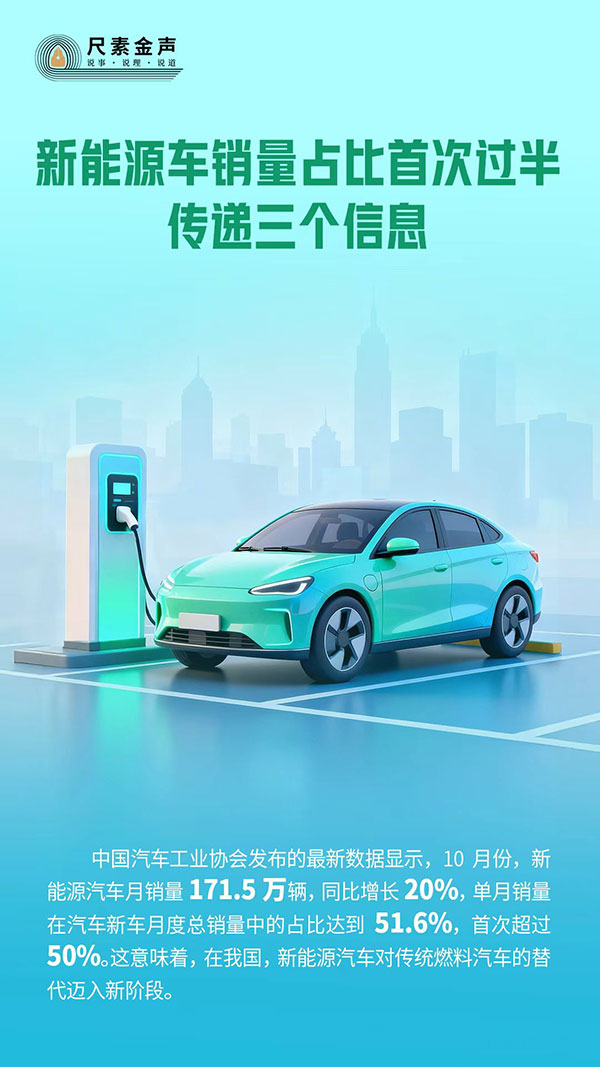 中国汽车工业协会发布的最新数据显示,10月份,新能源汽车月销量171.5万辆,同比增长20%,单月销量在汽车新车月度总销量中的占比达到51.6%,首次超过50%。这意味着,在我国,新能源汽车对传统燃料汽车的替代迈入新阶段。